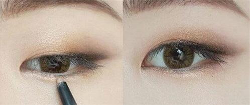 第四步:眼影部分基本就完成了,接下来画眼线,为了让眼线和眼影更好的过渡在一起,建议使用眼线笔,紧贴着睫毛根部画一条黑色的上眼线,颜色太重的话可以使用眼影刷沾取眼影晕染。再用珠光卧蚕笔在下眼睑前半段做晕染。