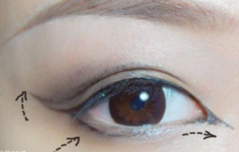 第二步:继续用深色眼影加深轮廓,加重双眼皮折痕,画出上扬眼线。用浓黑色眼线液笔填补内外眼线,眼头拉长出如图效果,下眼尾向下勾勒出一条轮廓,让眼睛看起来像鹿一样大而无辜,用白色眼线膏勾画双眼皮褶皱内和下眼睑前端,眼皮上下晕染珊瑚粉色眼线膏。用珠光白色提亮眉骨,贴好上下睫毛,眼妆就完成啦!