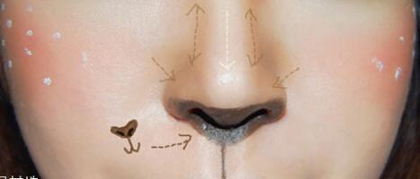 第四步:鼻翼两侧上重修容,鼻梁用白色高光粉一扫而过,用棕色哑光眼线膏在鼻孔周围涂色,并带下一条人中部位的细线。