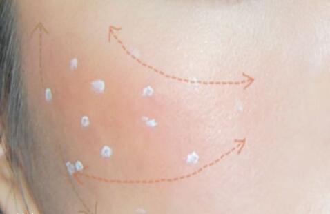 第三步:在颧骨部位以画“耐克勾”的方式上腮红,选用粉橘色腮红最佳,修容用浅棕色哑光修容饼,之后拿白色眼线膏在腮红范围点上白色圆点。