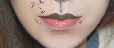 第五步:上嘴唇用棕色眼线膏涂满,下嘴唇先用棕色描绘轮廓,然后用豆沙色唇膏与之一并晕染,最后涂上一层有透明度的豆沙色唇彩。