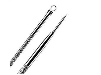 消完毒后用粉刺针尖的一头轻轻刺破粉刺发白部分。这一步需要掌握力度,注意手法,一定要保持90度垂直