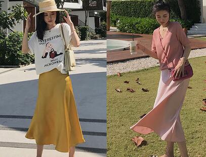 这款鱼尾半身裙真的是超美的,丝缎面料走动起来真的是波光辚辚的感觉,半身裙真的是百穿不腻的款。A字型的版型是最能遮掩各种身材缺陷的,什么腿型的女生穿起来都是带有轻微波浪的那种feel,让你上身就自带柔美和气质感。上装不管是T恤还是衬衫都美美哒~