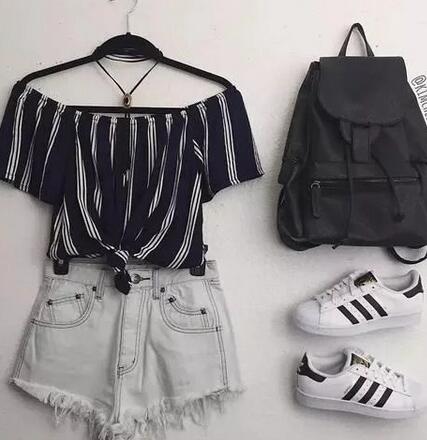 雪纺条纹一字衫,是不是显得有点小成熟呢?最适合大学生啦,搭配短裤或者长裤都是不错的选择哦。