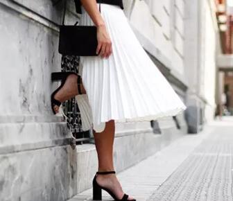 百褶裙一向是优雅的象征,细皱褶富有女人味而且适合日常,和一般的款皱褶在效果上差别很大。为什么说它难穿呢,因为它的垂直感虽然显瘦但是也容易显得臀部变大。像皮面等硬质的面料,还有绒面的厚面料尤其会显得整个人壮硕,如果不是很高的女孩就会被压矮身高。柔软轻薄的布料轻盈飘逸,在视觉上的拉直效果会更好。