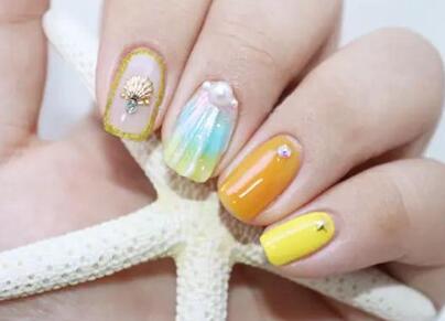 和整面的贝壳指甲相搭配的是小贝壳画案点缀。用金色甲油在指甲边缘涂出一圈边纹,将金色和雕花胶进行混合,蘸取少量在中间画出小贝壳,用蓝色小宝石点缀在中间。用相同用色在其他指甲上涂满纯色,让整副指甲充满靓丽,却不会显得繁琐。