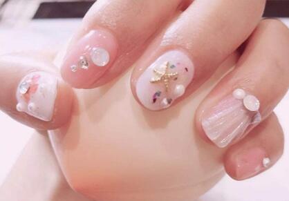 贝壳美甲美轮美奂,透明雕花胶可以和其他颜色混合变成各种清透靓丽的仙女色,上手的效果极佳。用海绵棒将银白色贝壳粉涂抹在指甲上,带来璀璨的效果。然后将透明雕花胶蘸取一些在指甲上画出绽放效果的贝壳纹理。等到它凝固变硬之后就会有立体纹理出现。在底部继续黏贴上小颗粒珍珠,表面涂抹上亮油就完成了这一个指甲。