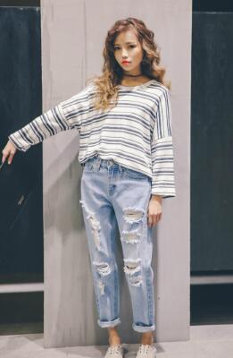 宽松的白色条纹上衣,简单清爽的黑白色设计,让人倍感清新,显得更有运动活力,搭配深蓝色小脚牛仔裤,让目光完全被美腿吸引,时尚的韩范风格。
