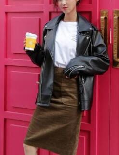 灯芯绒半身裙与黑色皮衣很配哦,不同的材质搭配在一起会给人特别的味道。像是这款棕色的灯芯绒半身裙本来就给人一种复古的味道,搭配上酷帅的黑色皮衣和清新的白色T恤,时尚的感觉立刻就出来了,而且这种时尚感显得特别高级,特别有韵味,仿佛黑白相片般给人一种岁月沉淀后的迷人感,特别棒哦。