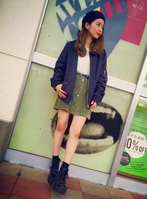 素T加上绿色灯芯绒裙,穿上一件MA-1外套就够保暖!