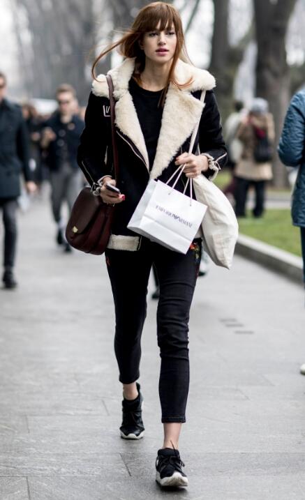 近年来,这类皮毛一体的外套非常受欢迎,既保留了机车服的帅气,又多了羔羊绒的温暖,而且还显瘦不臃肿,和运动鞋的休闲范儿起来非常和谐。