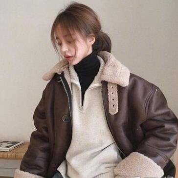 冬天穿什么保暖?羊羔毛外套一定要走一波,这种拼接皮面的羊羔毛外套款式更偏夹克一点,袖口和领口的地方稍微露出一点毛毛看着就很温暖,大板型更是帅气,用POLO衫款式针织衫打底,最里层是黑色高领衫,让你在穿酷酷版型的同时一样显瘦!