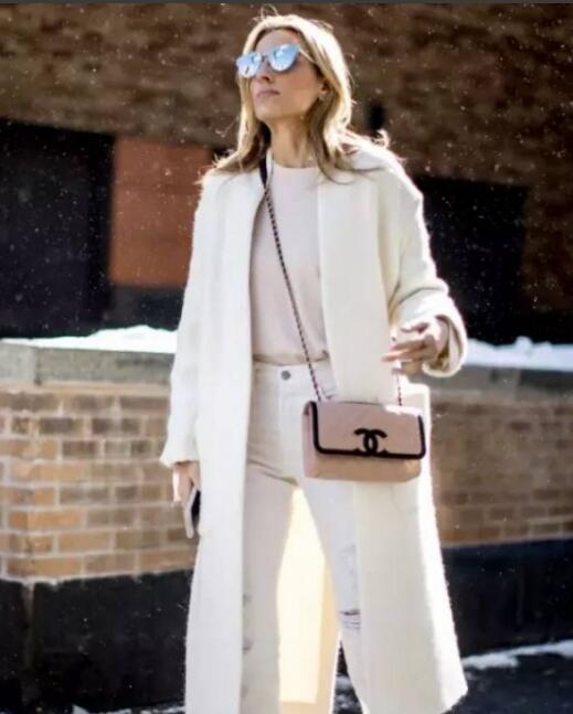 浅色毛衣搭配白色大衣,加上棕色系的短靴,全身都是暖色调的搭配,优雅感就出来了。
