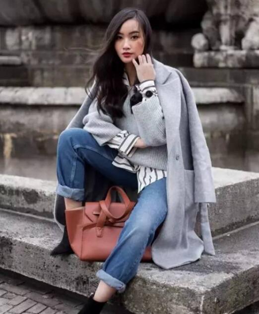 不想太乖巧,就换成宽松版型的毛衣,把秋天刚换下来的条纹衬衫搭进去,非常休闲随性~(注意袖口要露出衬衫袖子,细节分+10!)
