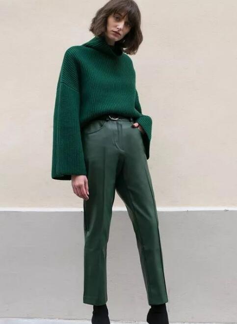 绿色毛衣+绿色皮裤,两种质感立马撞击出一种fashion的火花!