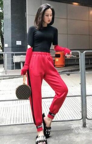 中国传统就是要在初一买裤子,寓意着在新的一年大富大贵,所以新年选择红色的休闲裤子穿再适合不过了,而且这条裤子很百搭,一年四季都适合穿,实用性超级强呢,和黑色打底衫搭配,很简约的风格,也不失时尚。