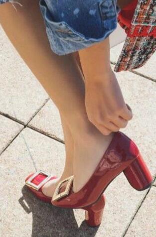 都说女生穿上高跟鞋会气质立刻不一样了,而今年新年要入手新鞋,选择红色的高跟鞋再适合不过了,还是今年很流行的皮扣点缀,穿上立显大长腿和高挑视觉噶了,搭配同色系的格子裙,有色彩的相呼应,增加了时尚色彩感。