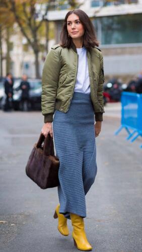 寒冷的冬天,针织裙是最好的裙装选择,不管是连衣裙还是半裙,都能凸显身材比例,而且十分保暖,就算风再大,针织裙也不会乱飞。羽绒服搭配针织裙可以说是入门级的穿搭方式了,还能温暖加倍,想要裙子和羽绒服一手抓的小仙女,一定要学起来!不过,因为羽绒服比较厚,不管是针织连衣裙还是针织半裙做内搭,都建议要打造高腰线。