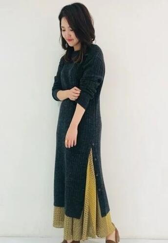 今年冬天长款针织毛衣裙可是特别火,特别是侧面开叉的款式,被认为是显瘦修身首选,因为裙摆开衩设计,直接出打底裤好像有点low?建议试试内搭纱裙或雪纺裙,因为材质轻薄,所以不会很显腿粗,柔软的材质还能增加甜美感,让整个穿搭更显女人味!冬季穿腻了打底裤的时候,一条这样的雪纺裙绝对能让你眼前一亮,像这种快要到脚踝的长度,穿的时候内搭肉色丝袜或者不穿打底裤也是可以的,适当露肤视觉上更显瘦。