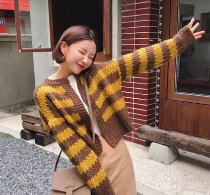 冬季A字短裙和毛衣搭配,黄色和棕色撞色的条纹毛衣搭驼色短裙就很俏皮,撞色上衣增加活力感,搭短裙清纯可人,长度在膝盖以上的A字短裙适合下半身曲线明显的小个子女生穿。