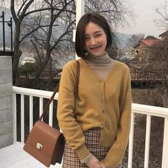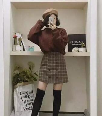 卡其色格纹短裙也是冬季首选项,搭黑色打底袜也不违和,上衣杏色高领+姜黄色针织外套韩系十足,甜美又俏皮的一种穿搭,休闲通勤都适合,套上大衣就可以美美出门了。