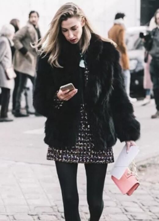 黑色打底袜+黑色皮草大衣+黑白呢绒短裙