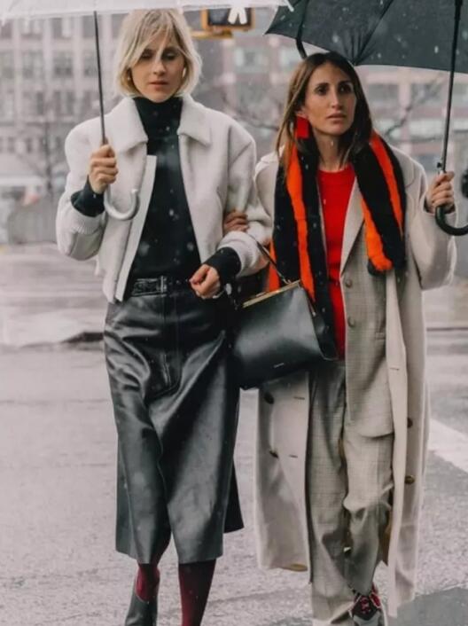 偏深的暖橘色可以将肌肤衬托得无比白皙,搭配全黑的内搭,温暖中又带来一丝性感的感觉,打底袜与黑色马丁靴的配搭则能将双腿衬托得无比的纤长高挑。