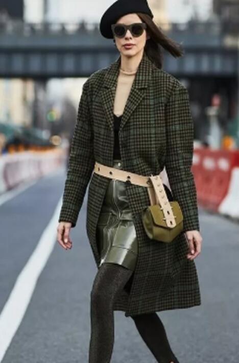 灰色绒面打底裤+亮面包臀裙+格纹大衣