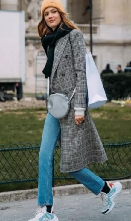 格纹大衣充满了英伦的风气。牛仔裤与打底袜的搭配看似繁琐实则不然,打底袜选择百搭的黑色且不会遮住脚踝线条,避免了秋裤露出的尴尬场面发生。