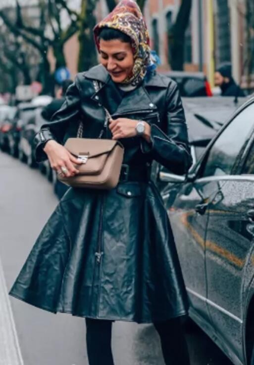 收腰的皮革大衣可以直接作为一件冬季复古的连衣裙穿着,宽大的裙摆可充满优雅独特的淑女气息,全黑的配搭在视觉上更显纤细的身材。