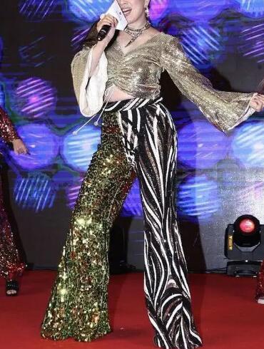短款的上衣使用了喇叭袖设计,所以能够为钟丽缇打造出比较纤细的上半身线条,而且这款上衣由于使用了短款设计所以更是能够让她的腰身得到很好的展露。下半身钟丽缇选择了拼接设计的喇叭裤来进行穿搭,左半边使用大量的亮片设计来进行搭配,右半边使用黑白配色的交织的条纹设计,这样会让她的穿搭更加的富有时尚感。