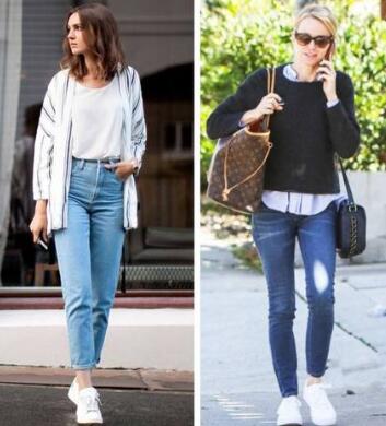 牛仔裤配小白鞋简单不失味道,哈哈,还不容易出错。衬衫牛仔裤配小白鞋,清新随性,文艺减龄,挽起裤脚之后,还显得轻盈许多。九分牛仔裤配小白鞋,利落休闲,又不失随性范,上身叠穿衬衫毛衣,丰富下层次感。依旧是小白鞋,配上猫须破洞牛仔裤之后,清新之中不失小个性,哈哈,满满的不羁feel。