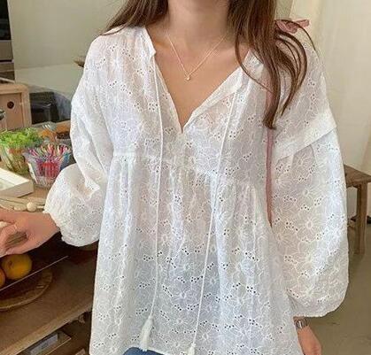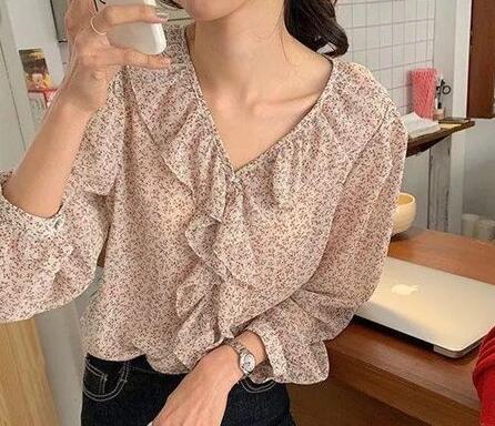 衬衫下摆扎进裤子里对梨型身材来说并不是很友好的,所以建议选择下摆比较宽的衬衫,像这种森女风衬衫就很适合,下摆宽松有弧度的款更适合你的身材。