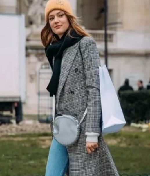 格纹大衣充满了英伦的风气。牛仔裤与打底袜的搭配看似繁琐实则不然,打底袜选择百搭的黑色且不会遮住脚踝线条,避免了秋裤露出的尴尬场面发生。