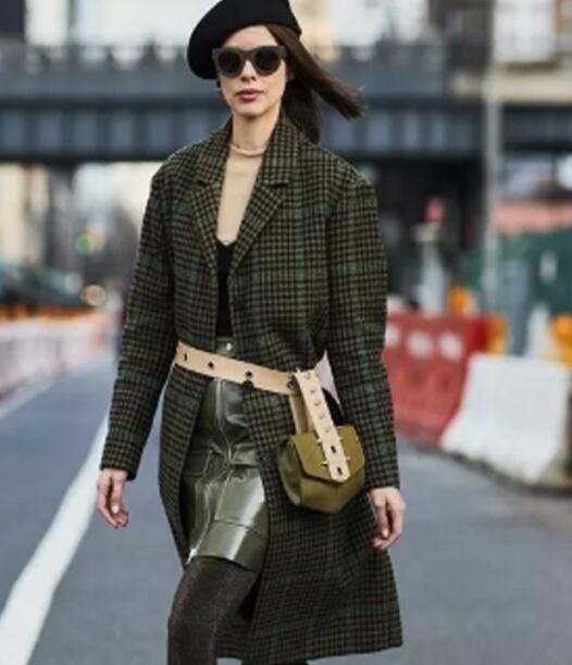 灰色绒面打底裤+亮面包臀裙+格纹大衣