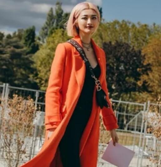 偏深的暖橘色可以将肌肤衬托得无比白皙,搭配全黑的内搭,温暖中又带来一丝性感的感觉,打底袜与黑色马丁靴的配搭则能将双腿衬托得无比的纤长高挑。