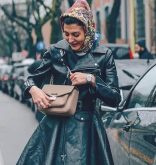 收腰的皮革大衣可以直接作为一件冬季复古的连衣裙穿着,宽大的裙摆可充满优雅独特的淑女气息,全黑的配搭在视觉上更显纤细的身材。