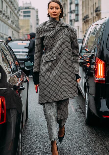 直筒式灰黑格子大衣+灰色牛仔七分裤+黑色高跟鞋