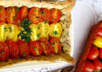 原料:香芹几棵、小番茄200克、派皮面团150克(80克面粉、1个鸡蛋、30克黄油、盐2克、酵母1克、芝麻1勺)。
