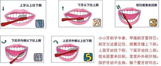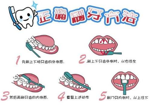 分区刷洗,首先把全口牙齿按上下、左右,分成若干小区(每个区约包括2~3个牙齿);依次刷洗,按照一定次序,如先上后下,先左后右,先外后内地刷洗,以免遗漏;三面刷洗,唇颊面、腭舌面和咬合面(牙齿咀嚼食物的那一面)都要刷洗到;重复刷洗,每个小区要求重复刷洗3~4次。