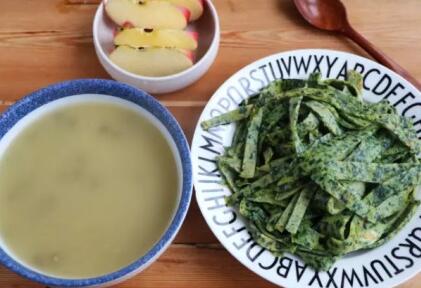 这里将茼蒿进行焯水之后剁碎了,然后加入两个鸡蛋还有少许的面粉和水之后就可以制成面糊糊了,接着不粘锅里倒入面糊糊就可以制作成简单的茼蒿小饼了;再搭配上小米绿豆粥,还有水果苹果简直是太完美了~