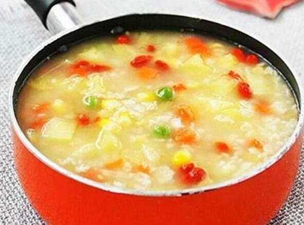 做法:将枸杞子洗净泡软,菠萝、胡萝卜去皮,切丁;玉米粒、豌豆清洗干净;锅中加入清水适量,下入玉米粒、甜豌豆煮熟;再放入燕麦片、枸杞子、胡萝卜、白糖煮约5分钟;出锅时,放入菠萝粒。