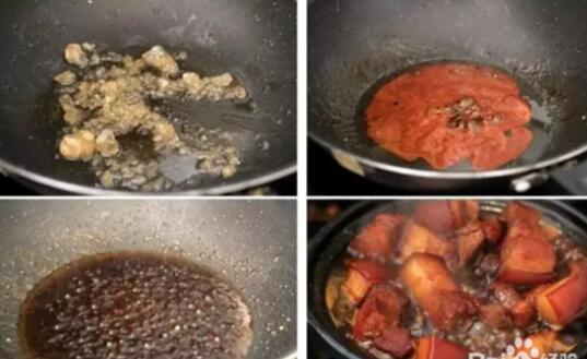 炒红糖:先在锅中放油,加入红糖,一直搅拌,熬至起沫后,关火。小心且迅速地加入适量温水,将其搅拌均匀,做成调味汁,浇到五花肉上。再倒入适量生抽,盖上盖,降低火候,煮约45分钟,使酱汁变浓。
