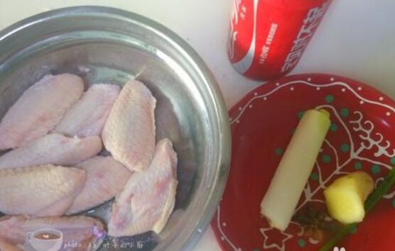 准备:鸡翅 八个 可乐 一听 生姜 一块 八角 一个 料酒 适量 生抽 少许 油 少许 盐 适量 小葱 少许 大葱 一段