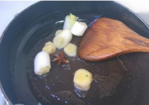 锅里加入少许油,放入生姜、大葱、八角炒香
