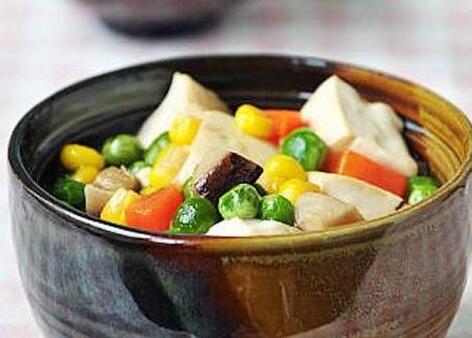 1、干香菇用冷水泡发;胡萝卜去皮切丁;甜玉米和甜豌豆解冻;韧豆腐切成小块。