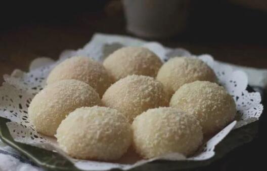 6、裹入事先切好的芒果丁;包起,捏紧收口;将糯米滋放入椰丝中滚一圈,用手略略压实即可。