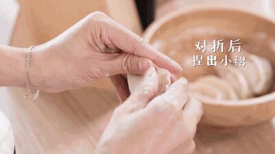 06.现在我们可以开始包饺子了!对折稍微捏一下边缘,在捏出一个个小褶子。