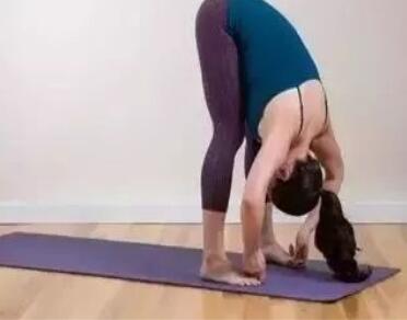 继续上一个动作,这时候要注意让你的双腿站直,上身下弯,双手可以去抓住脚部的脚趾;如果身体的柔韧性不够做不到位的话可以慢慢递进,稍微屈膝一下或者轻轻触摸到脚面即可;头部自然放松,保持这个动作一分钟即可。