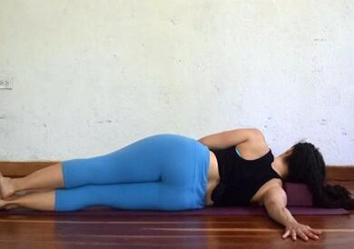 俯卧,头部贴于地面;呼气的时候身体向右侧转动,用左手支撑住身体的前身,头部落在砖上;吸气的时候身体后背靠去,侧卧,右手向右侧眼神,十指张开;保持这个动作一分钟,接着换为另一侧即可